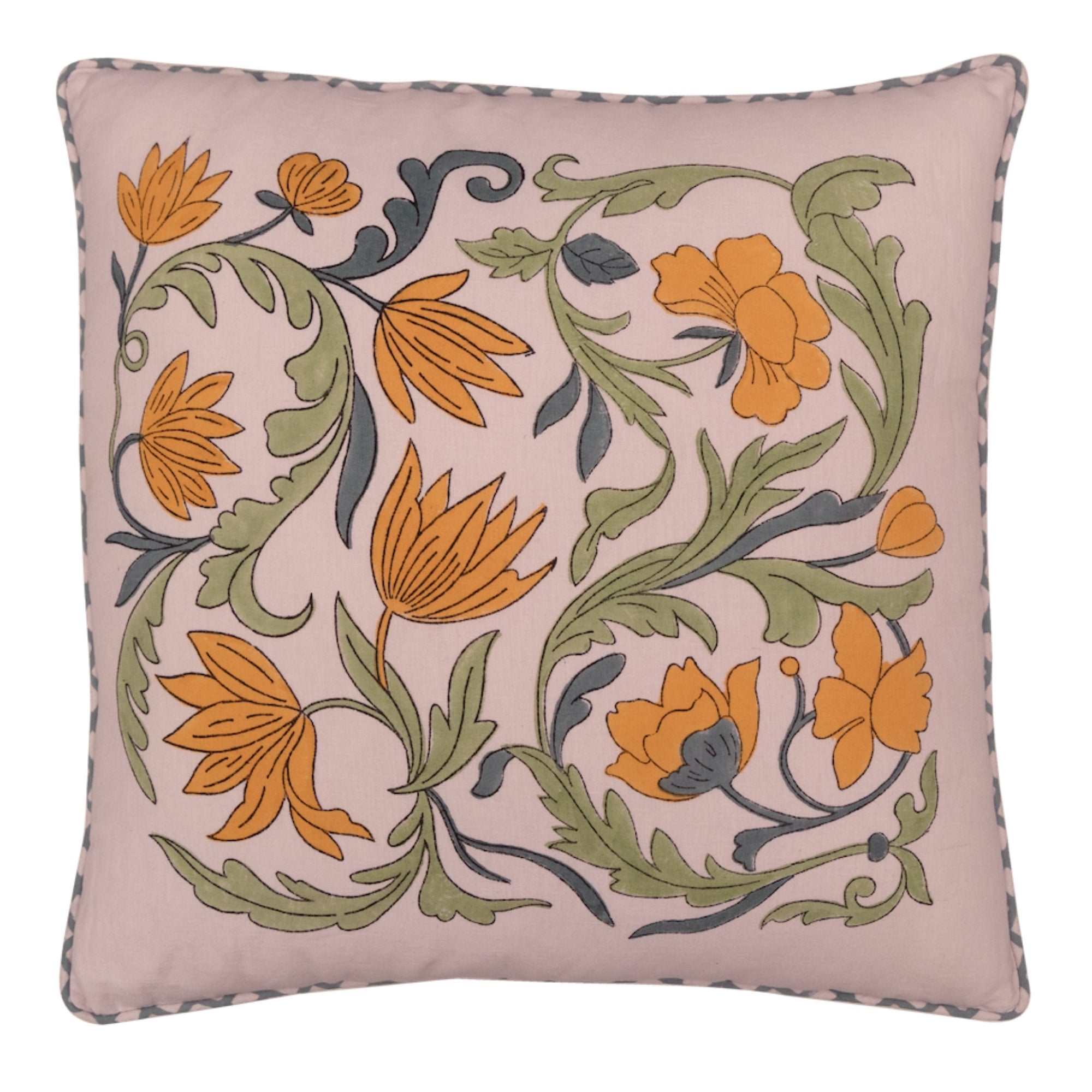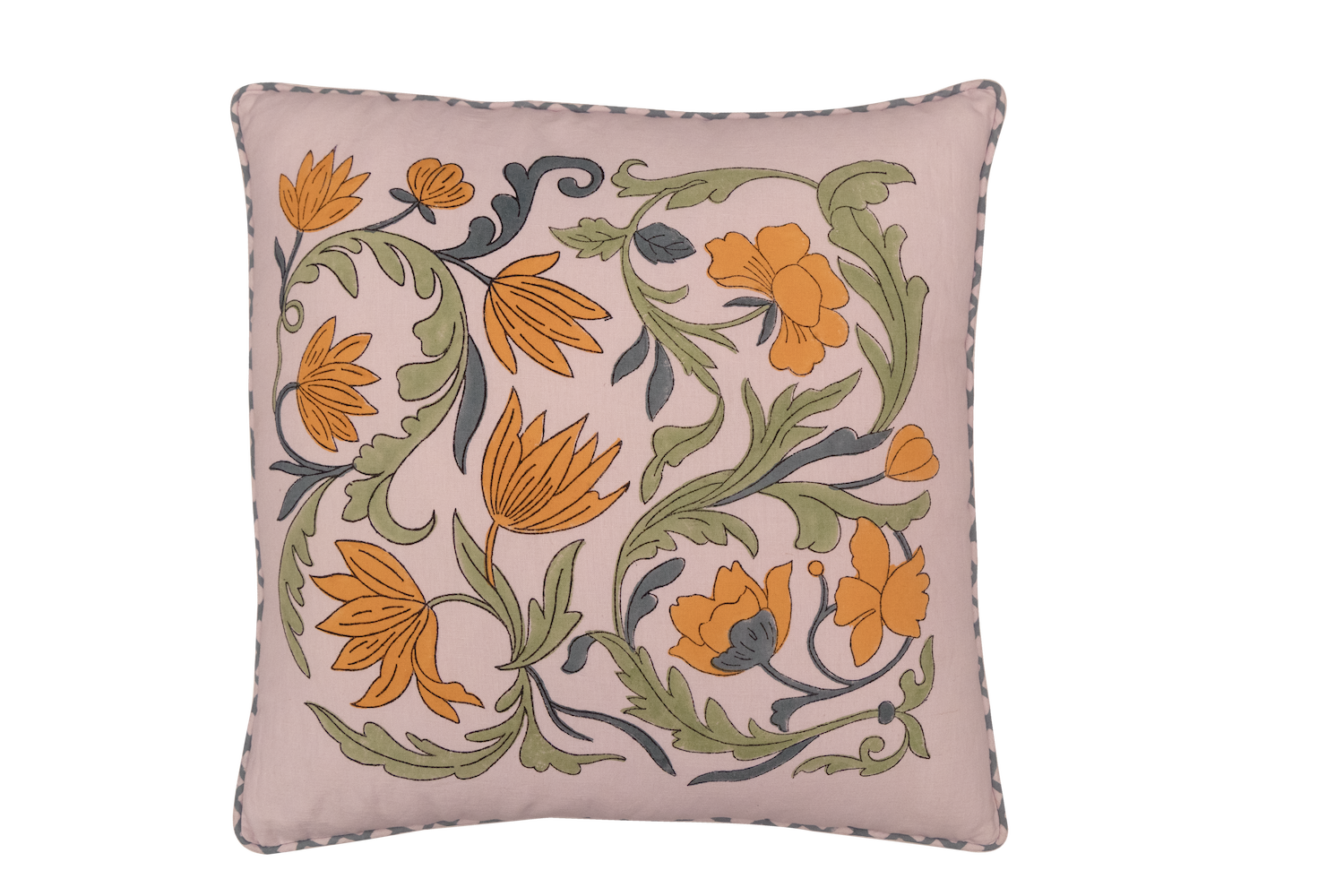 Each cushion is hand printed in small batches using Sanganeri methods, resulting in gentle variations that celebrate slow design.