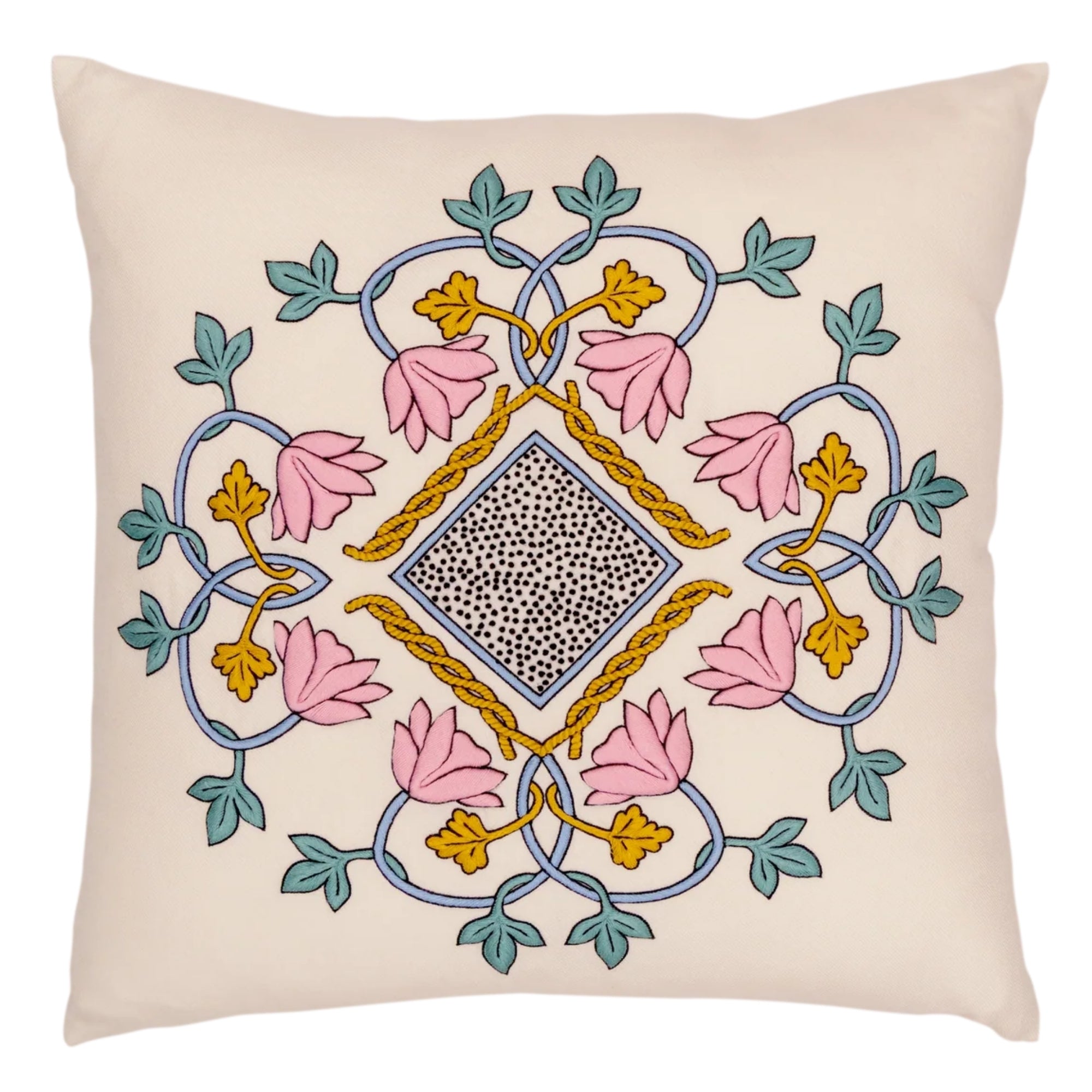 This off white Merino wool cushion cover showcases fine hand embroidery, blending heritage craftsmanship with a timeless modern aesthetic.