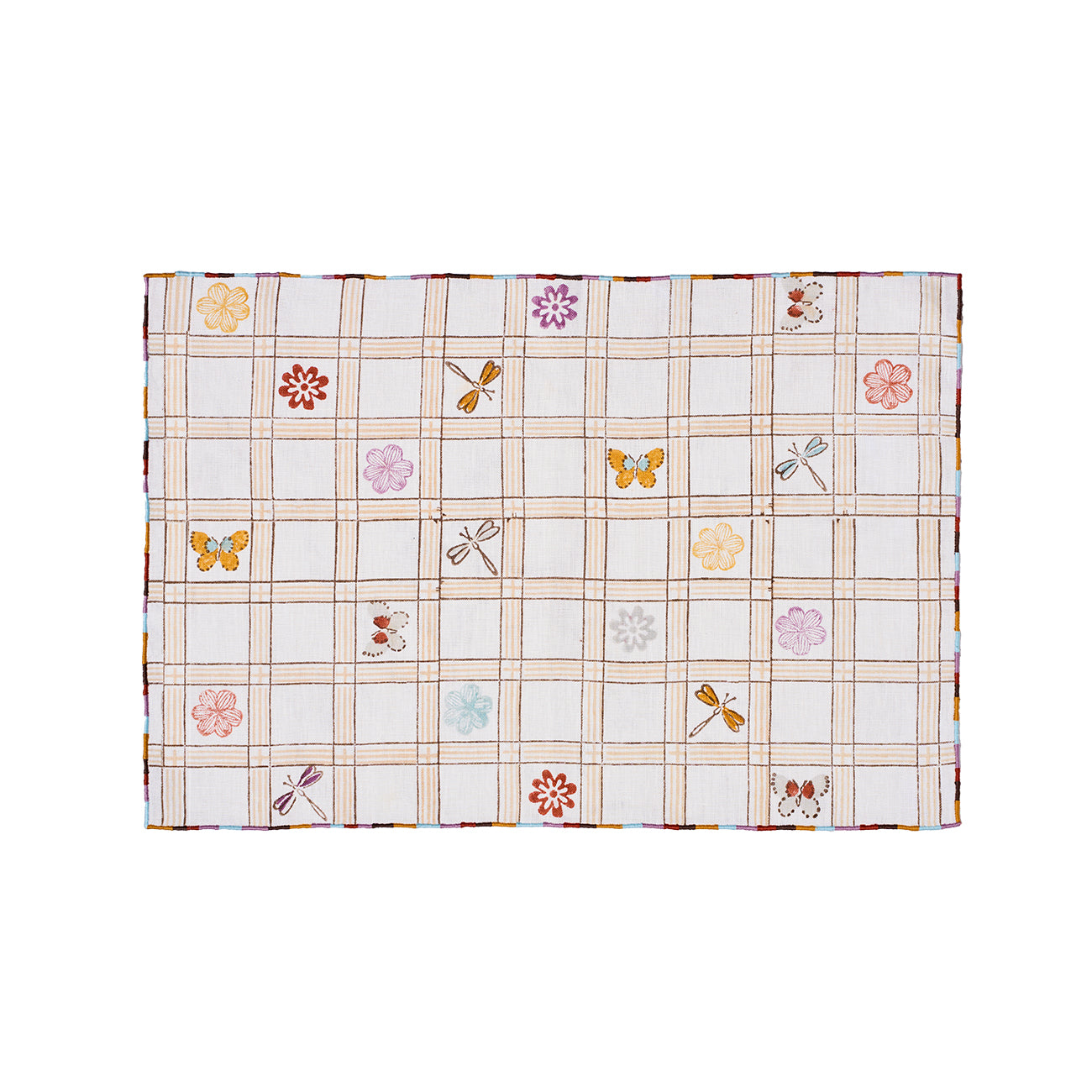 Hand block printed by adept artisans, these pure linen placemats burst with playful patterns of butterflies and wildflowers, rendered in vibrant, eco-friendly hues. The standout feature is the hand-embroidered border, meticulously crafted in beautiful colors, adding an extra layer of elegance and sophistication.