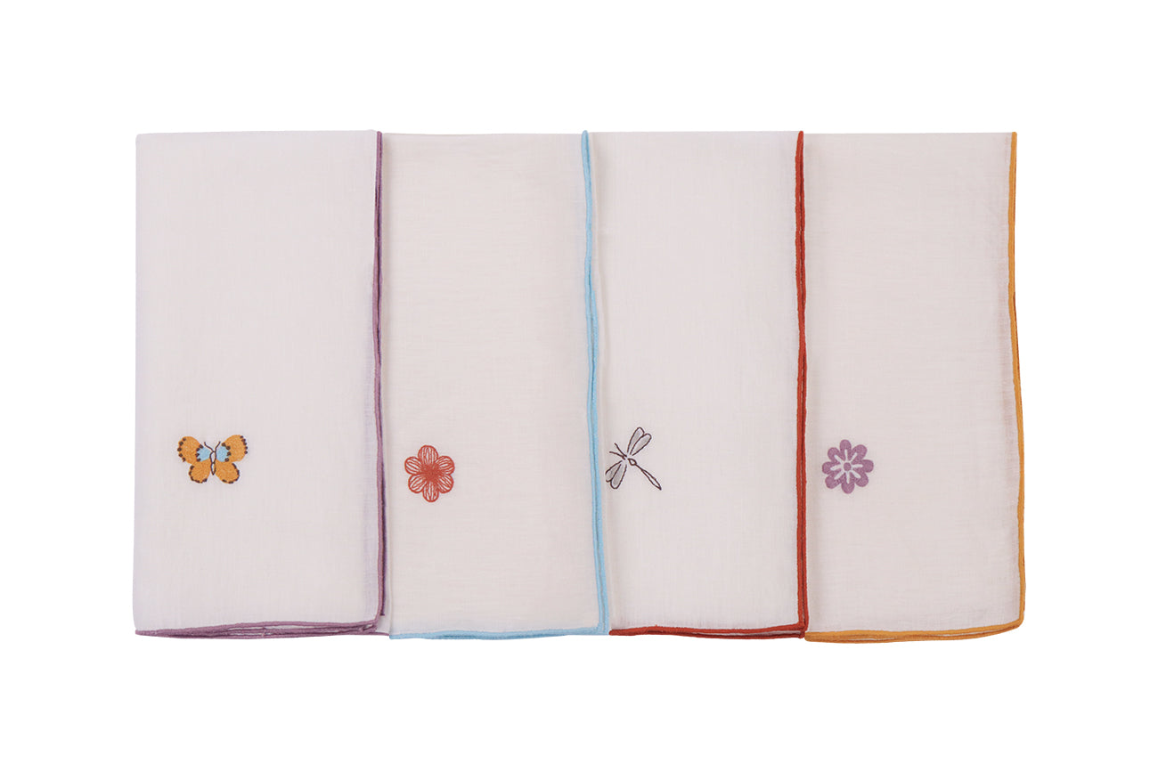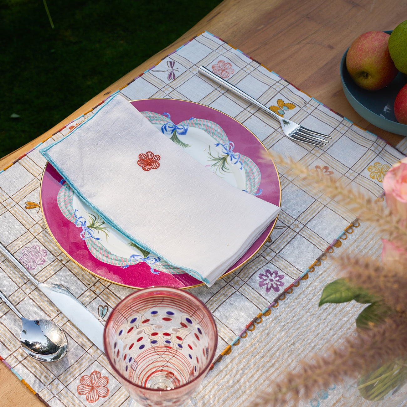 The charming hand embroidered table napkins are enhanced with unique hand embroidered details, adding a playful yet sophisticated touch to your table setting.
