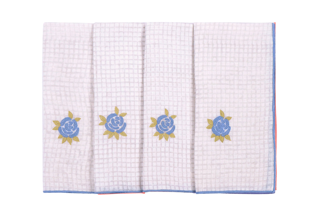The matching pure linen napkins, adorned with hand block prints and a delicately hand embroidered rose, bring a refined simplicity to your dining setting.