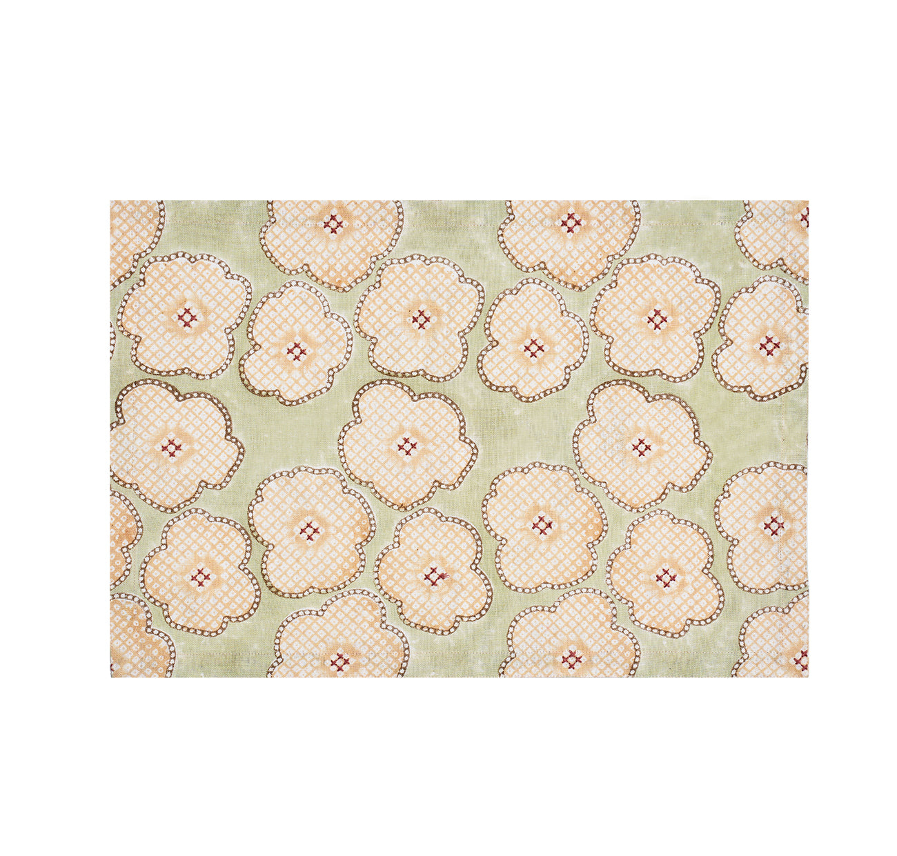 Made from pure linen, each placemat boasts a vivid, hand block-printed design featuring big, bold flowers and intricate hand embroidery within each flower.