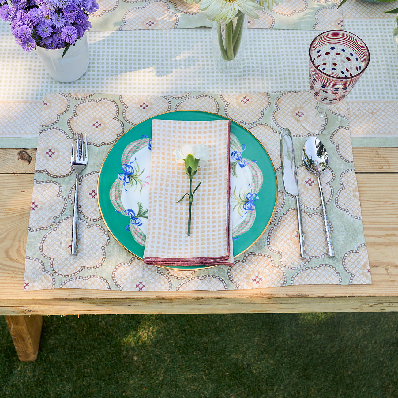 Included is our exquisite table runner, a masterpiece of artisanal hand block printing.