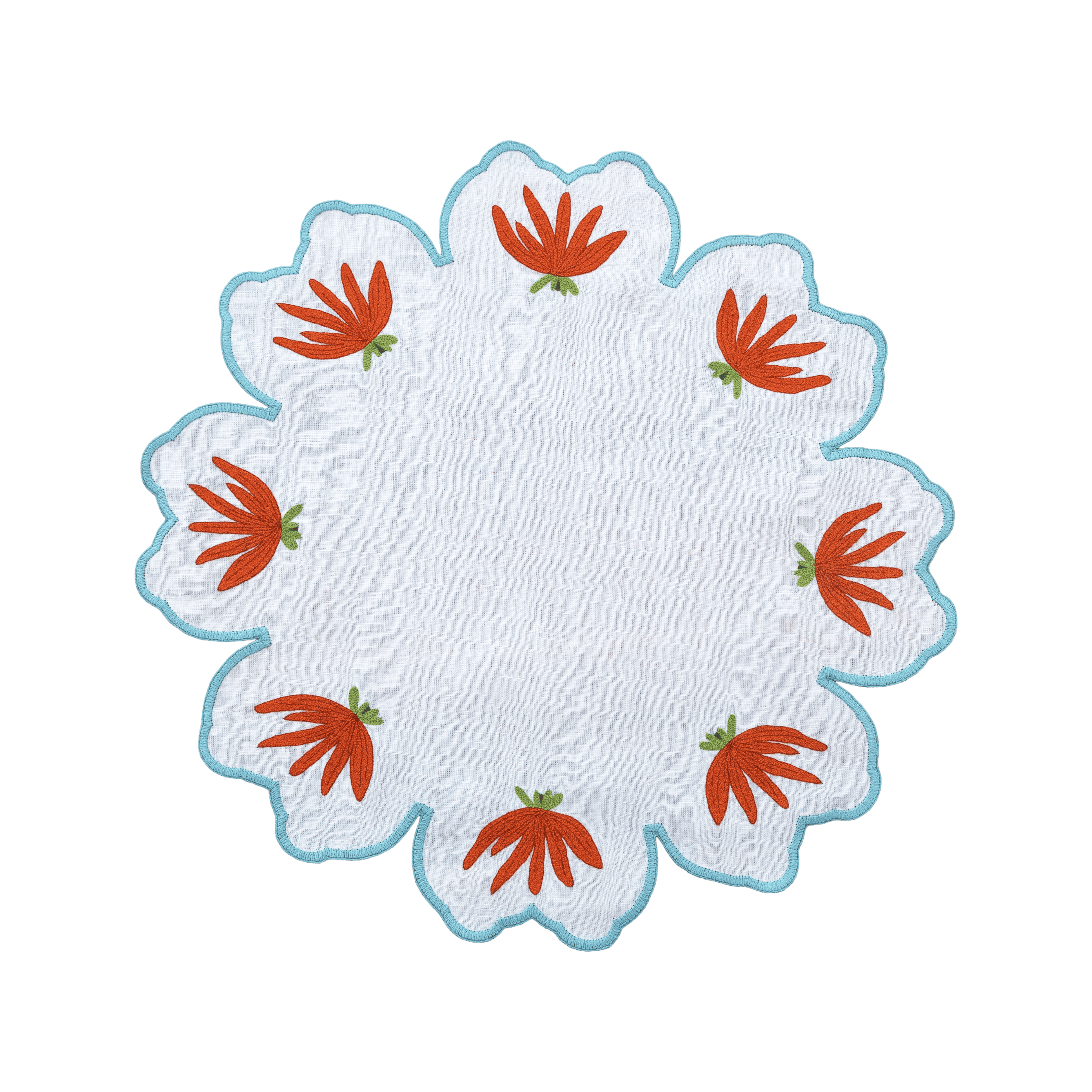 Brighten your table with this stunning hand-embroidered placemat, crafted from 100% premium linen in a vibrant orange hue. Inspired by the bold shapes of contemporary floral design, it features intricate hand embroidery that brings the modar flower motif to life.