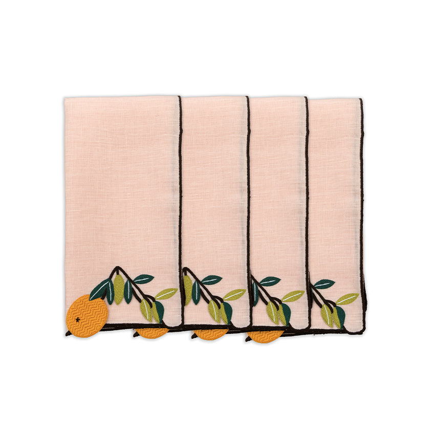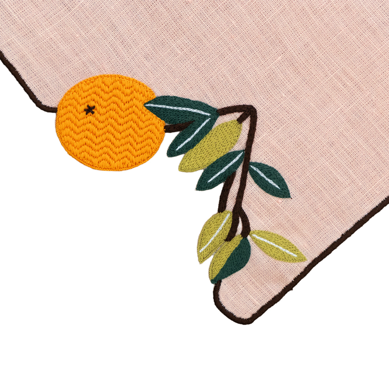 Made from soft pink linen fabric, this napkin features bold, hand embroidered oranges artfully placed along delicate vines, creating a lively yet elegant composition. The orange is enhanced with hand-cut detailing for added dimension and texture, showcasing exceptional craftsmanship.