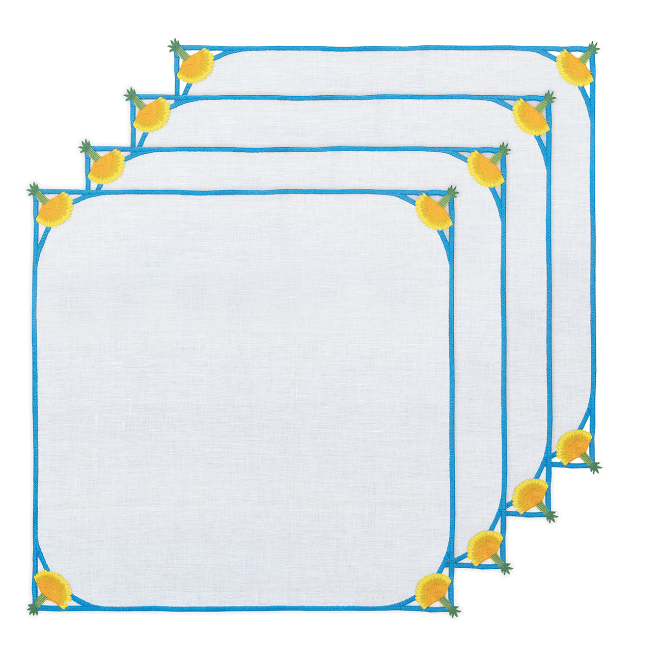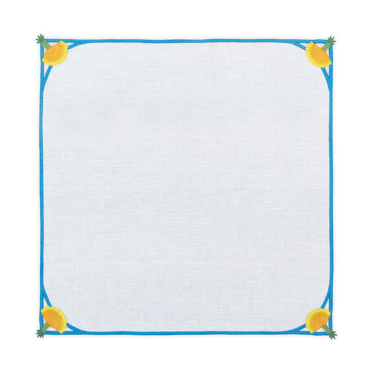 Modern, airy, and full of charm—this napkin brings a fresh take on floral embroidery. Featuring delicate hand-embroidered dandelions floating across a soft linen base, a hand-cut edge, finished with a striking blue embroidered trim, adds bold contrast and a contemporary silhouette.