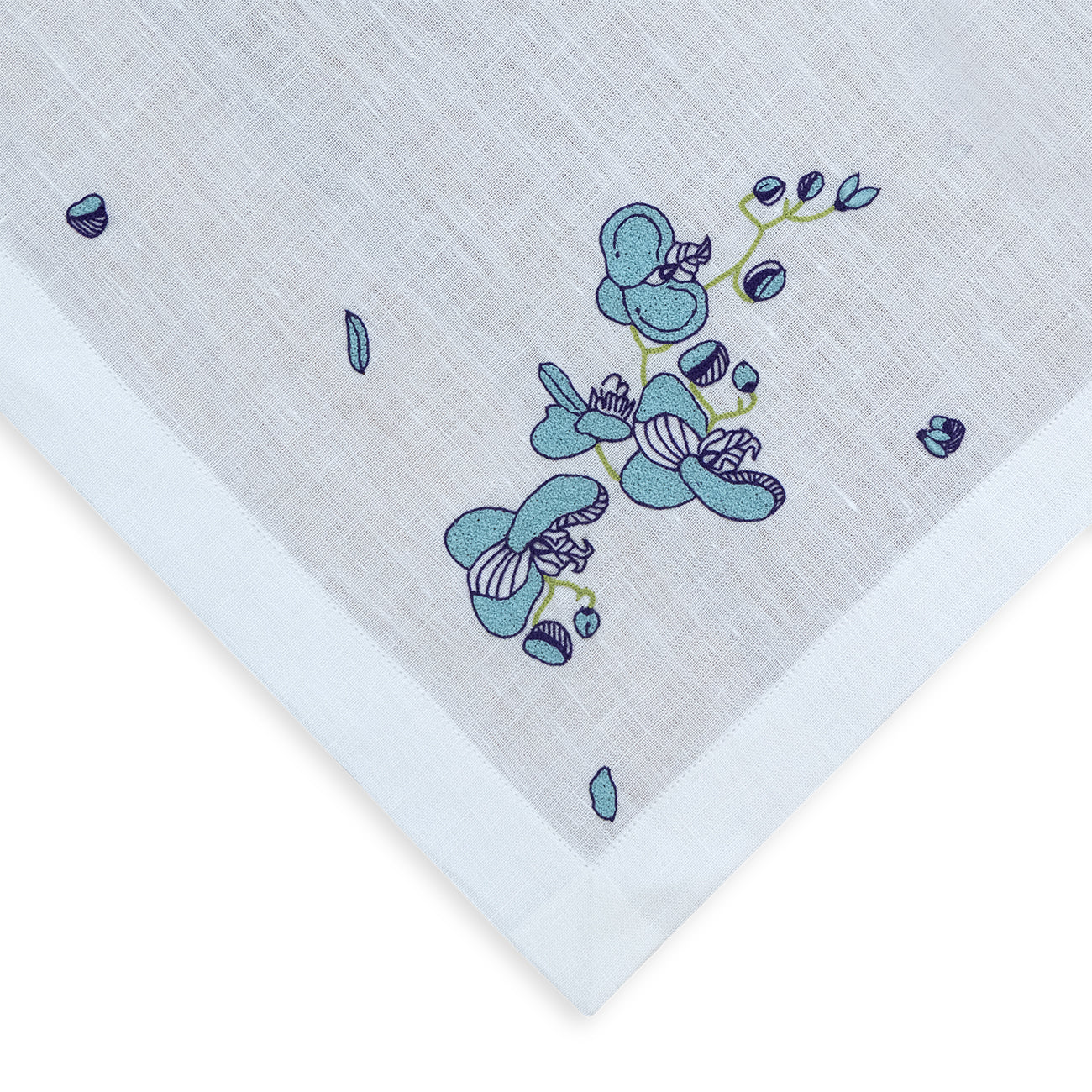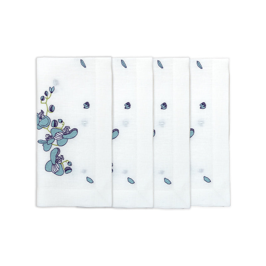 These beautifully hand embroidered napkins feature a playful interpretation of orchids. The orchids are thoughtfully placed, with flowing, organic lines that add movement and lightness to the design.