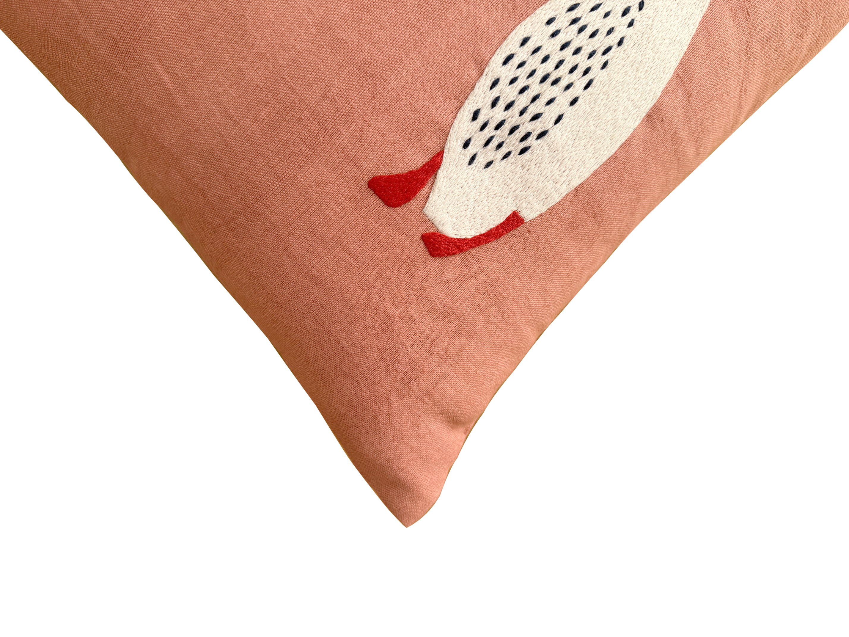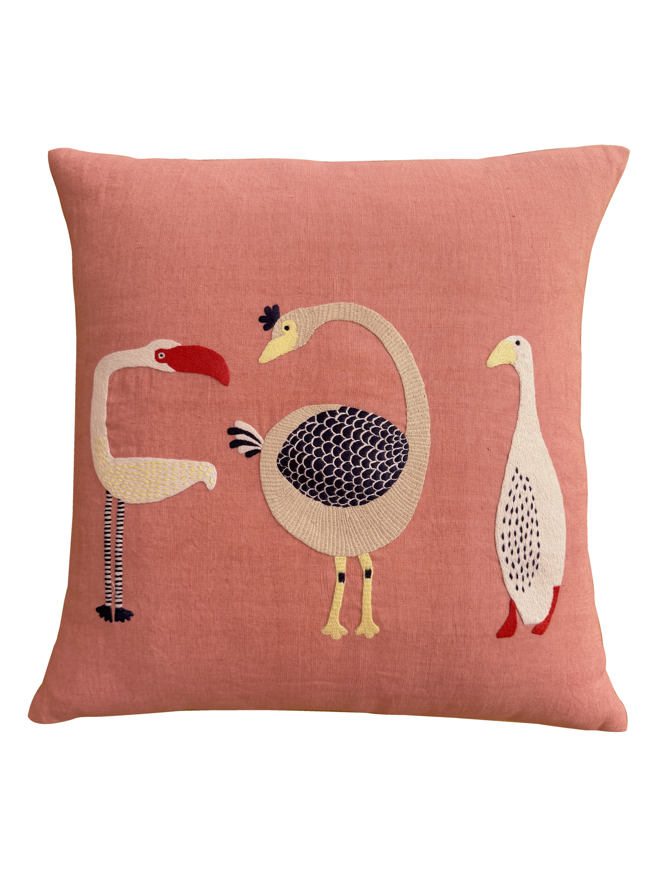 Brighten up your space with our artisan-made linen cushion cover, featuring playful, hand-embroidered birds in a fun and quirky design. Crafted with care, each cover is a unique blend of traditional embroidery techniques and whimsical artistry. The soft linen fabric adds a touch of natural elegance, while the charming bird motifs bring a lighthearted, joyful vibe to your home decor.
