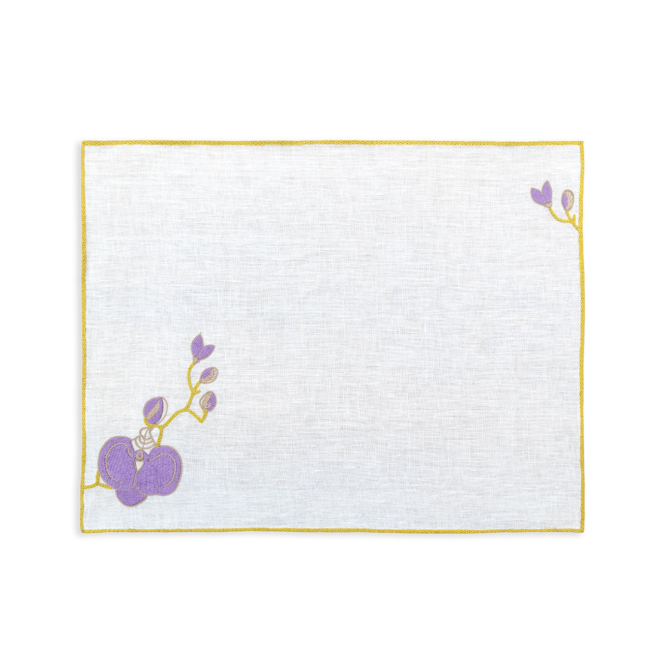 Featuring a beautifully hand-embroidered purple orchid delicately placed in the left corner, this placemat is a celebration of floral artistry. The design is framed with a unique yellow-green chainmail stitch that adds a soft pop of color and a refined finish.