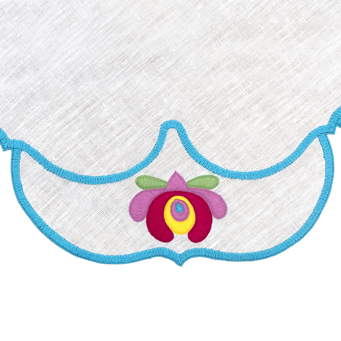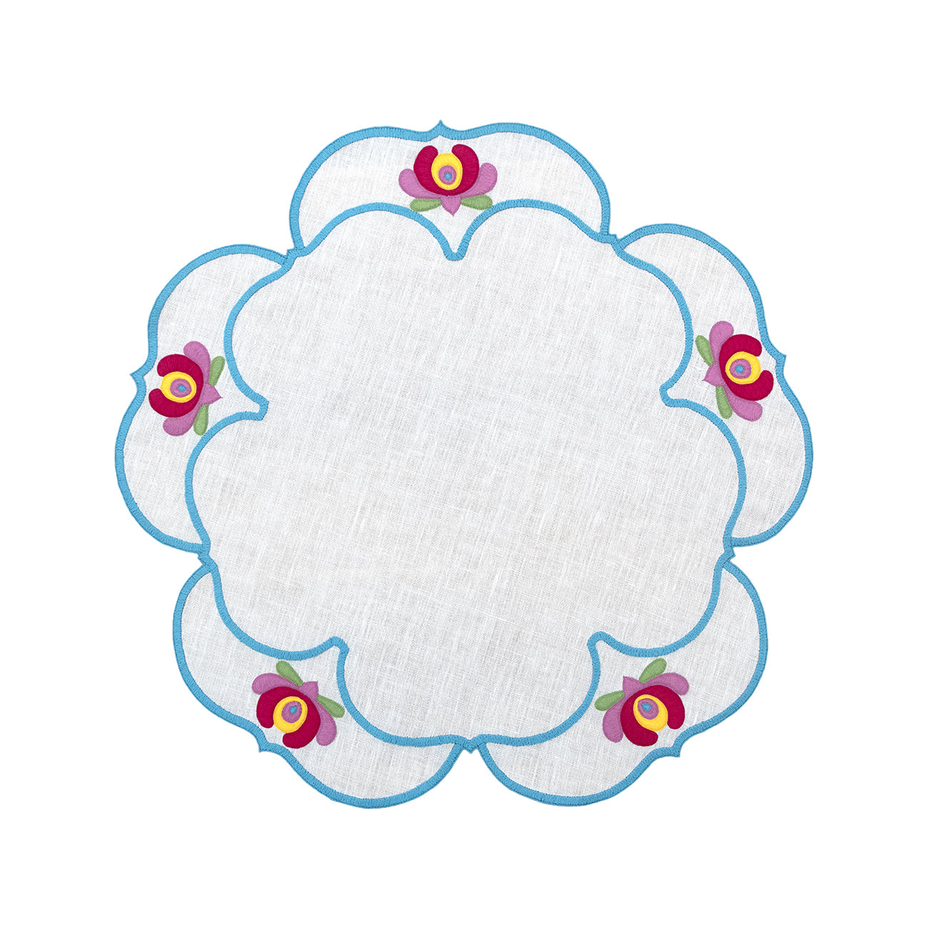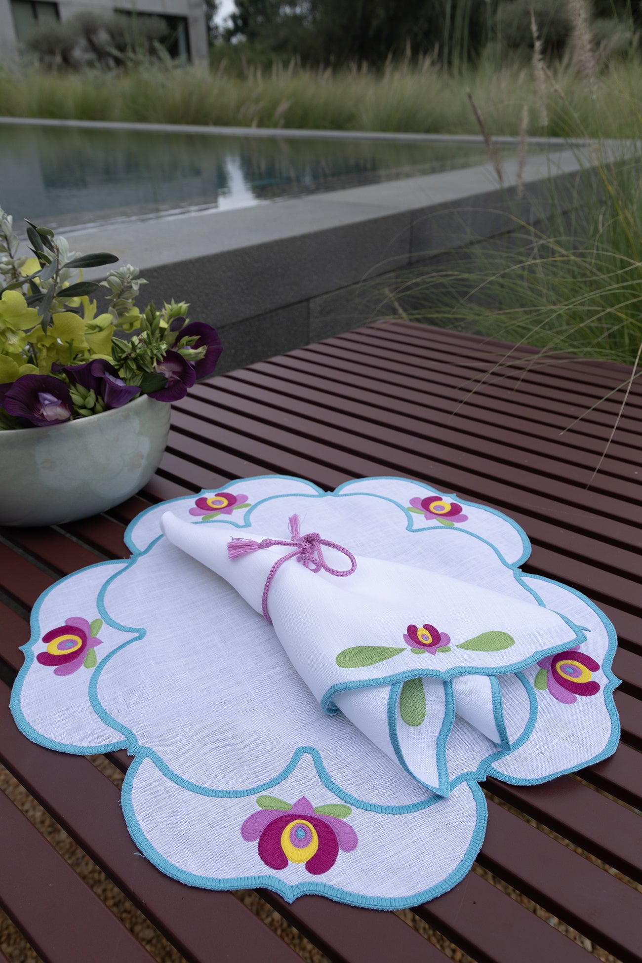 This vibrant placemat takes inspiration from the playful curves of the bulbous buttercup. Each piece is expertly hand-embroidered, showcasing delicate floral detailing. The standout feature is its unique, hand-cut petal-shaped edge.