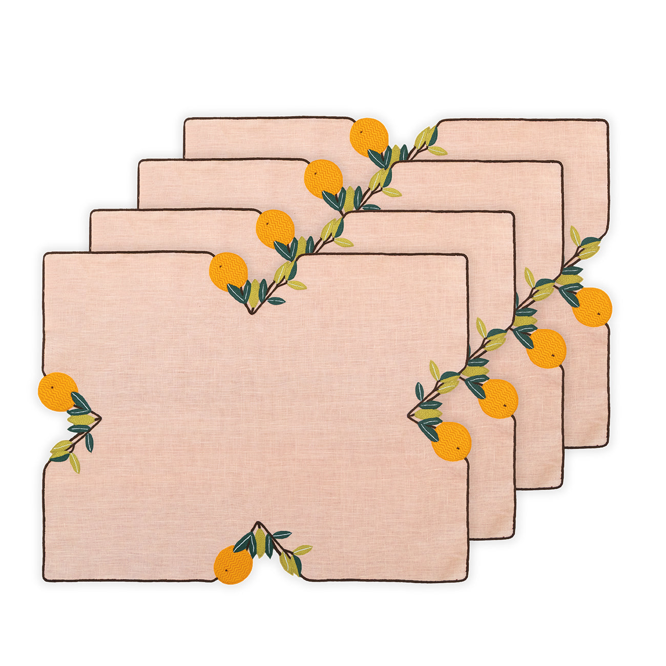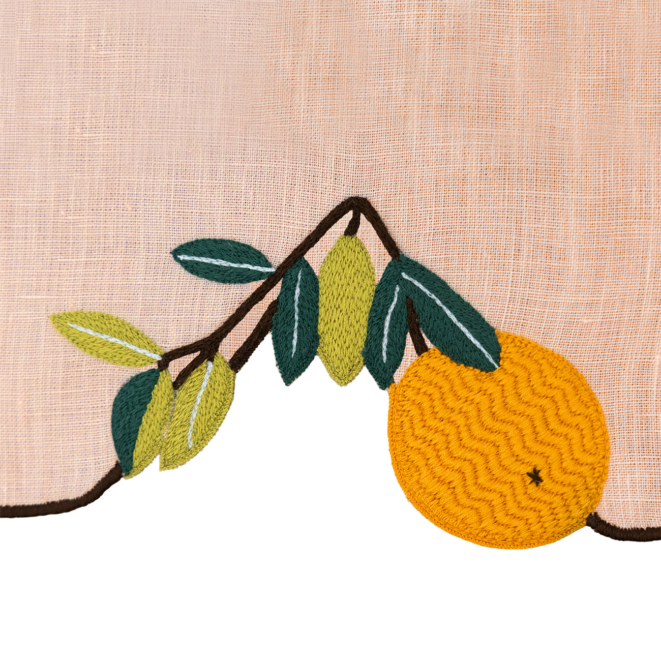 Made from soft pink fabric, this placemat features bold, hand embroidered oranges artfully placed along delicate vines, creating a lively yet elegant composition. Each orange is enhanced with hand-cut detailing for added dimension and texture, showcasing exceptional craftsmanship.