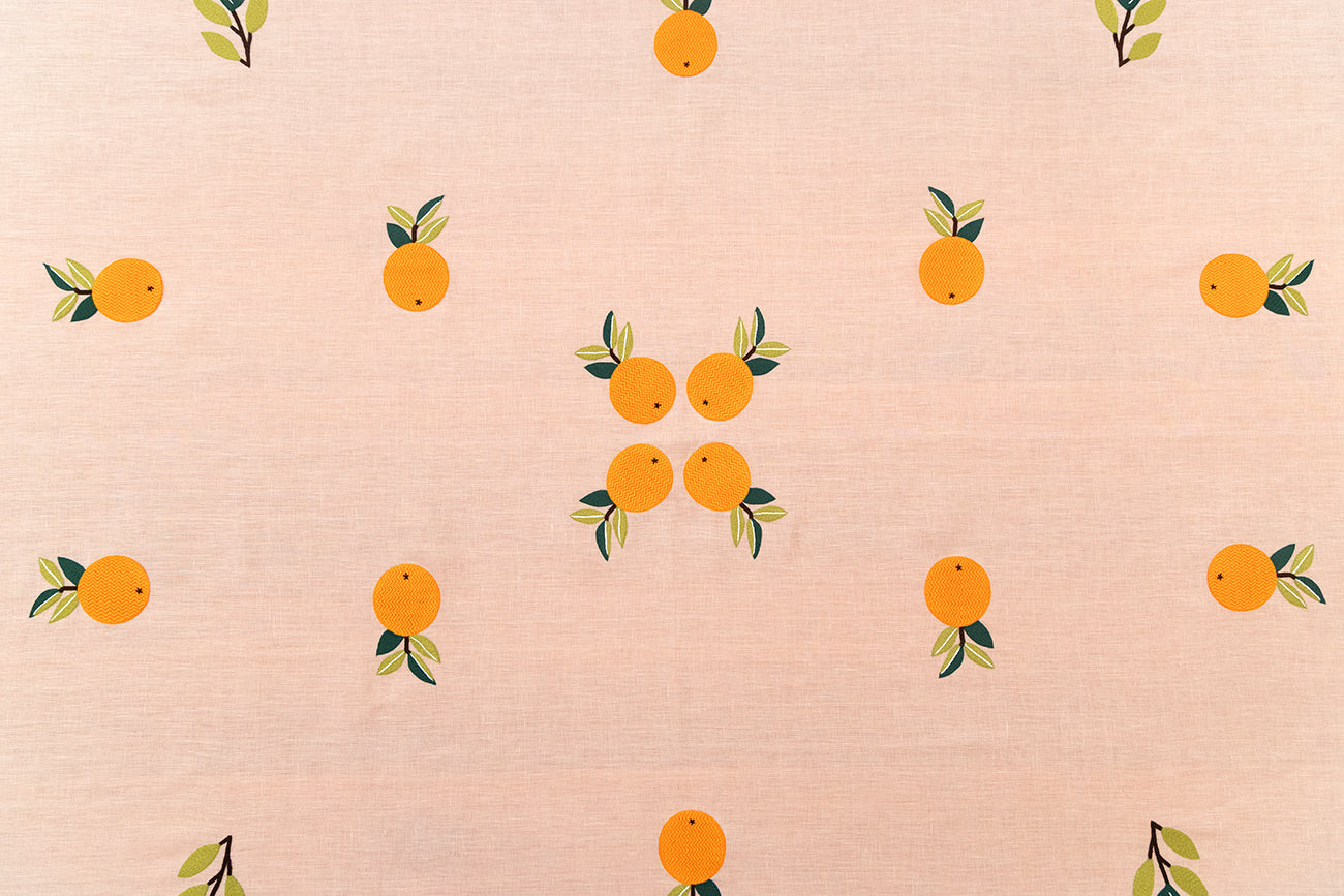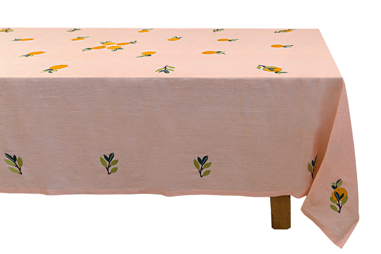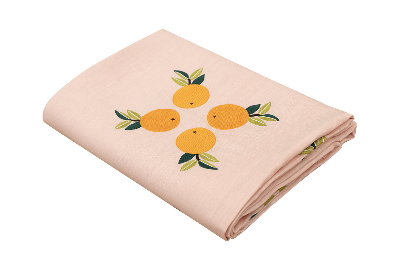Make a vibrant statement at your table with this exquisite soft pink-colored 100% linen tablecloth, beautifully adorned with bold oranges on the vine. Each piece features raised, hand-embroidered details that bring the fruit to life — from the textured orange peel to the curling green leaves -creating a striking, three-dimensional effect.