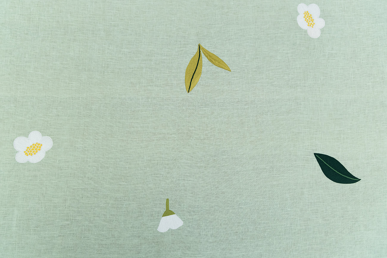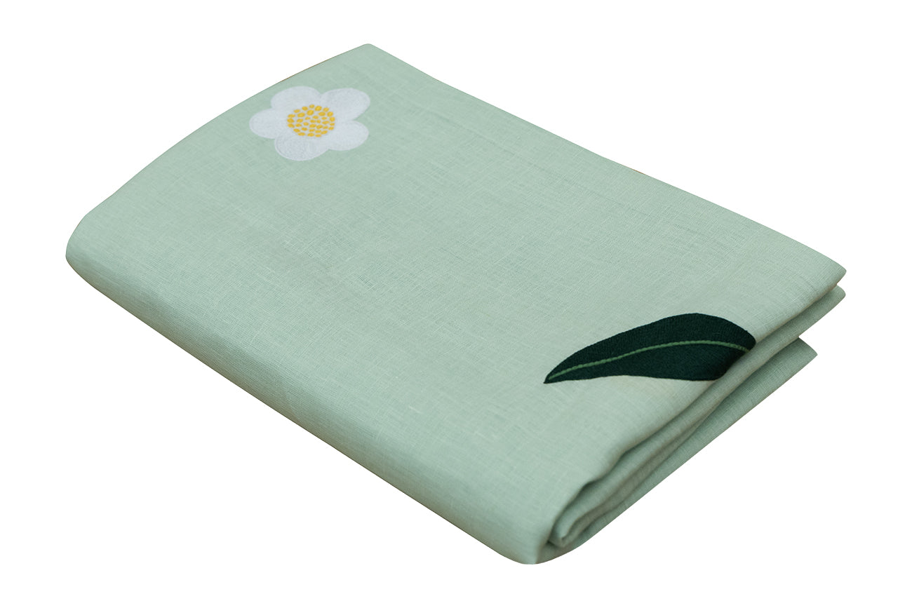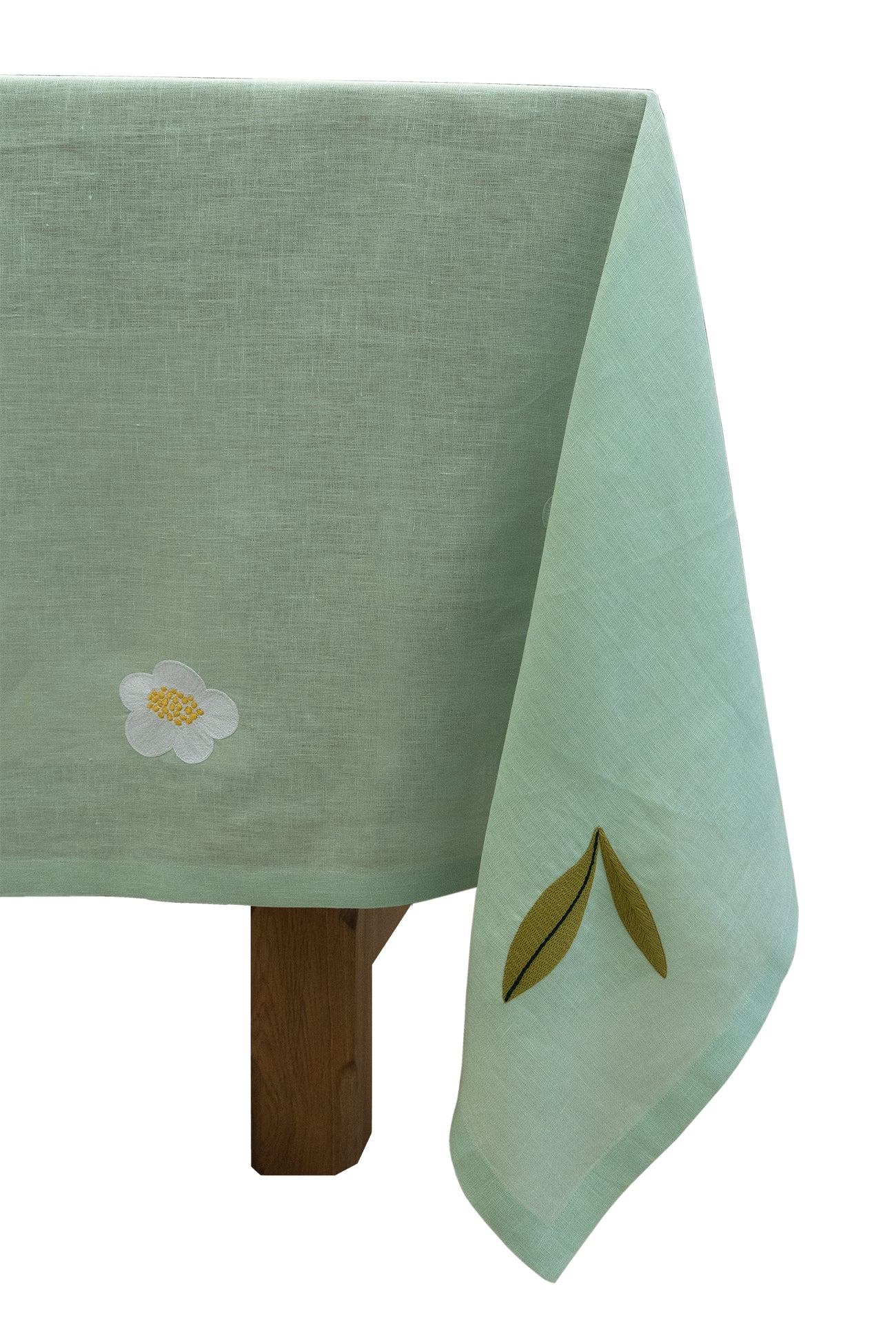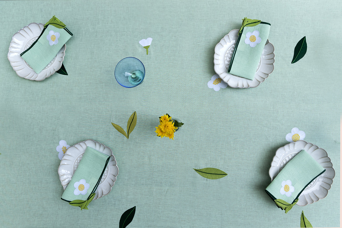 Add a touch of personality to your table with this vibrant green tablecloth, featuring bold white flowers and leaves embroidered by hand.