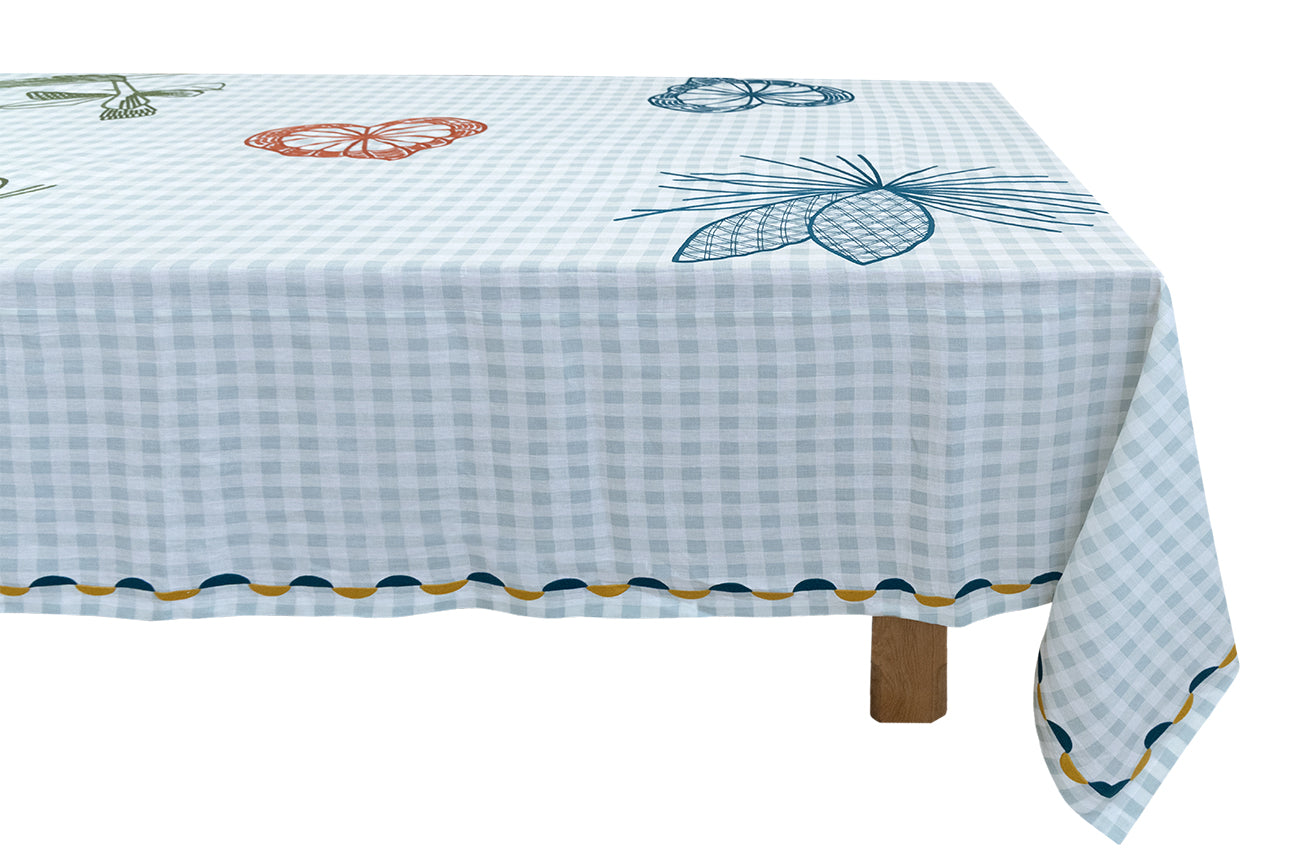 Invite the beauty of the forest to your table with this thoughtfully handcrafted tablecloth. Featuring a soft, hand screen-printed pale green check background, the design evokes the nostalgic charm of outdoor picnics and woodland walks.