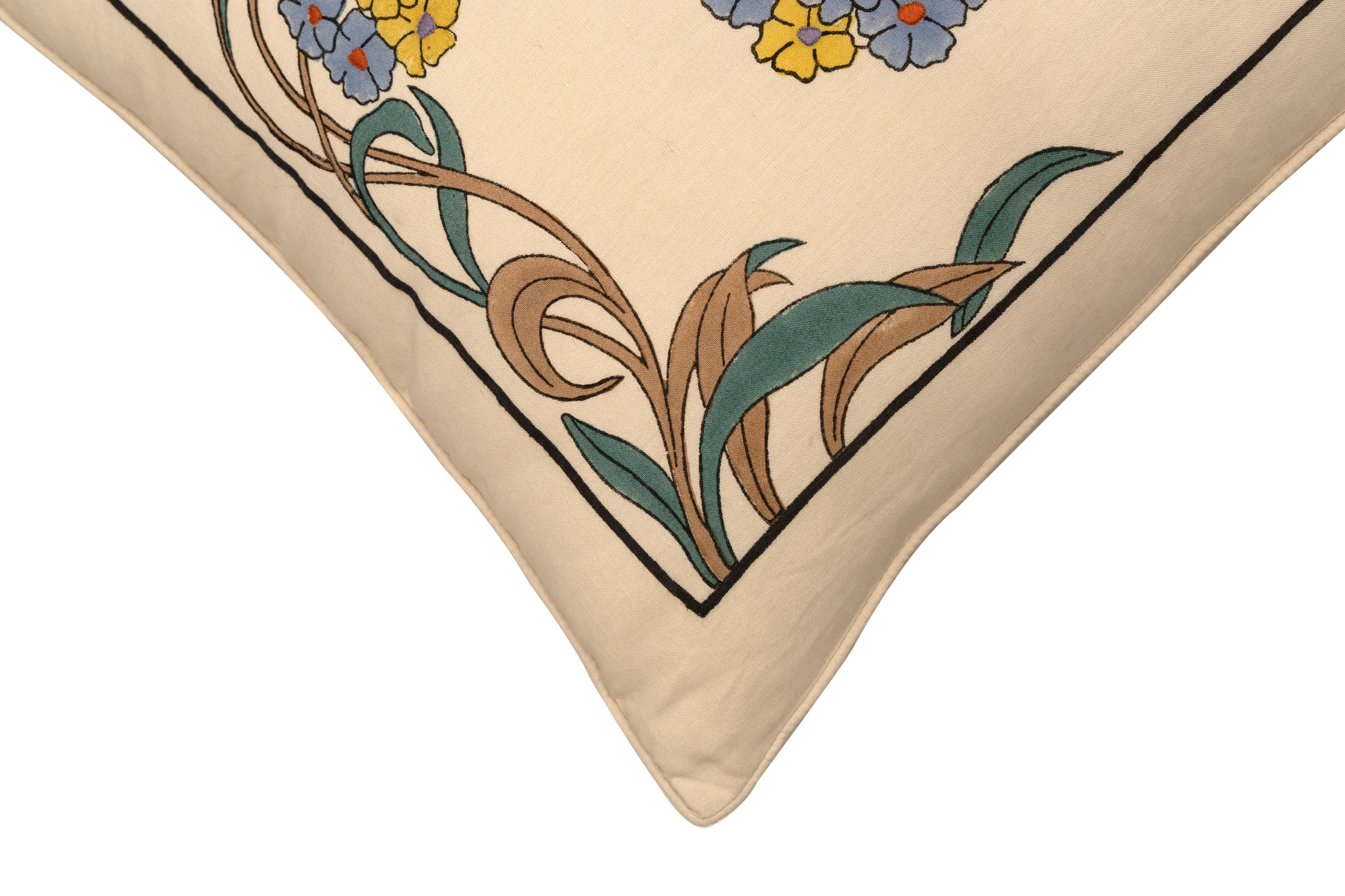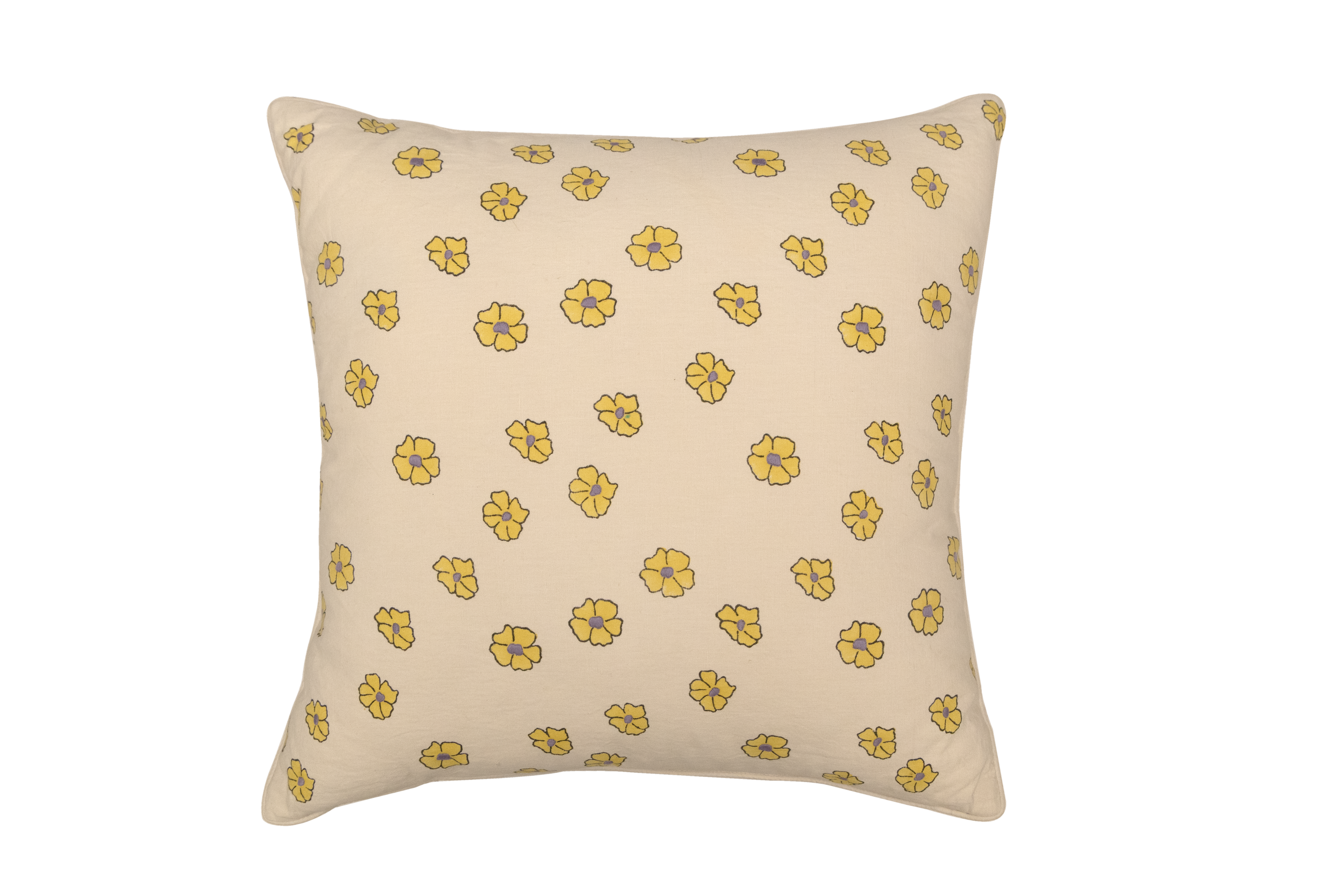 This cotton-linen cushion is decorated with hand-stamped Sanganeri motifs that add warmth and individuality. Designed for layering, it works beautifully across sofas and beds.