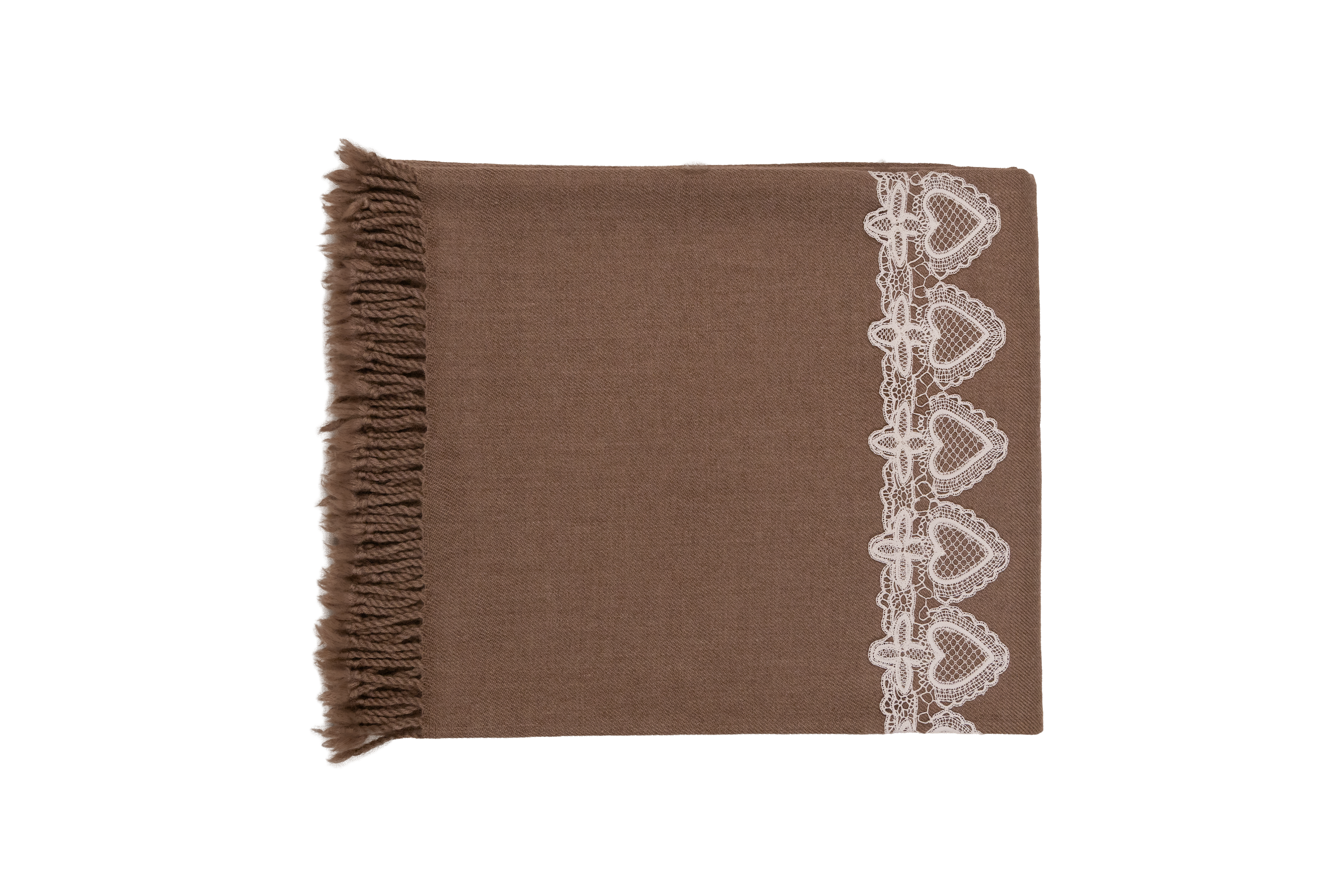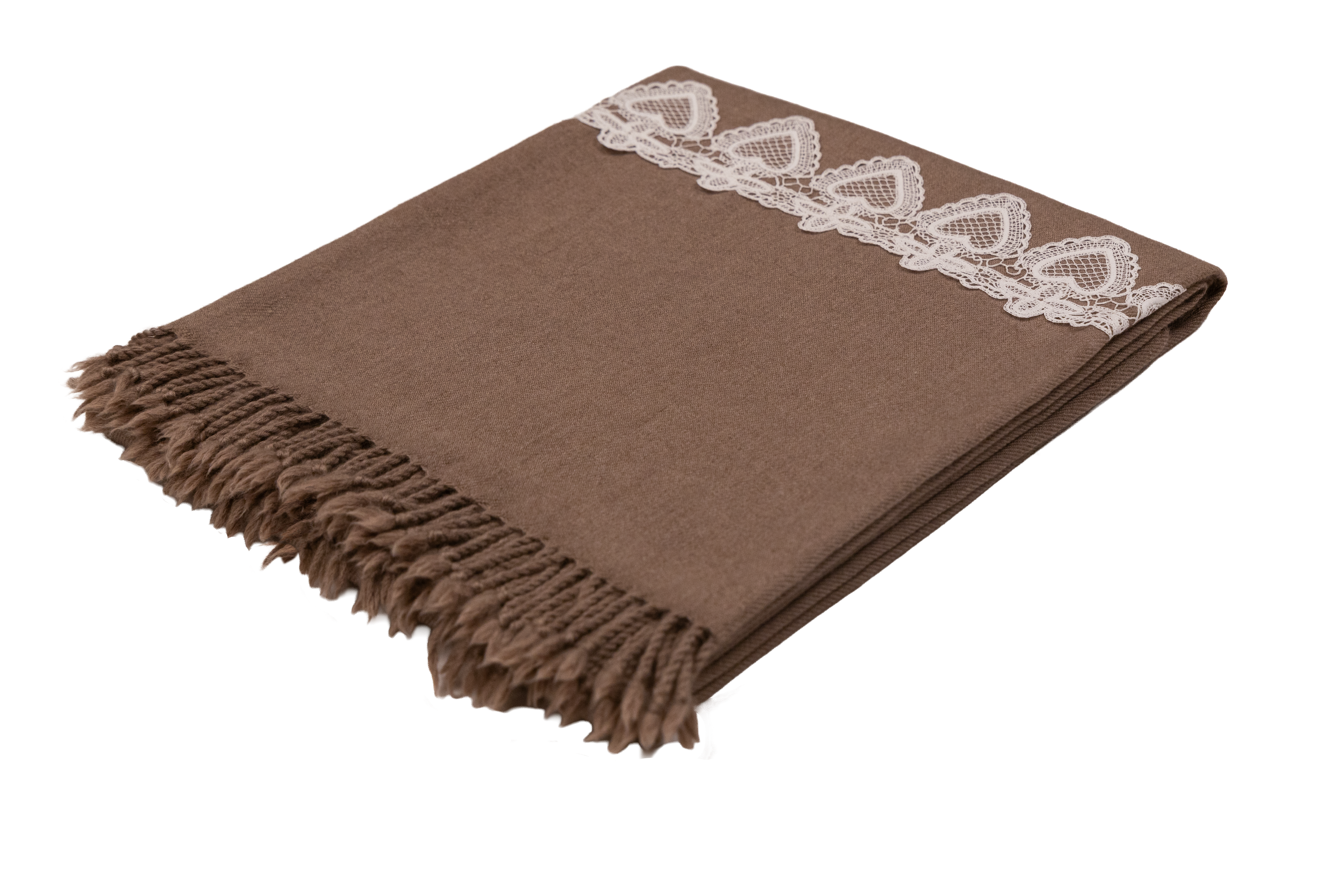 Finished with delicate bobbin lace, this dark brown pashmina throw blends heritage embellishment with modern comfort.