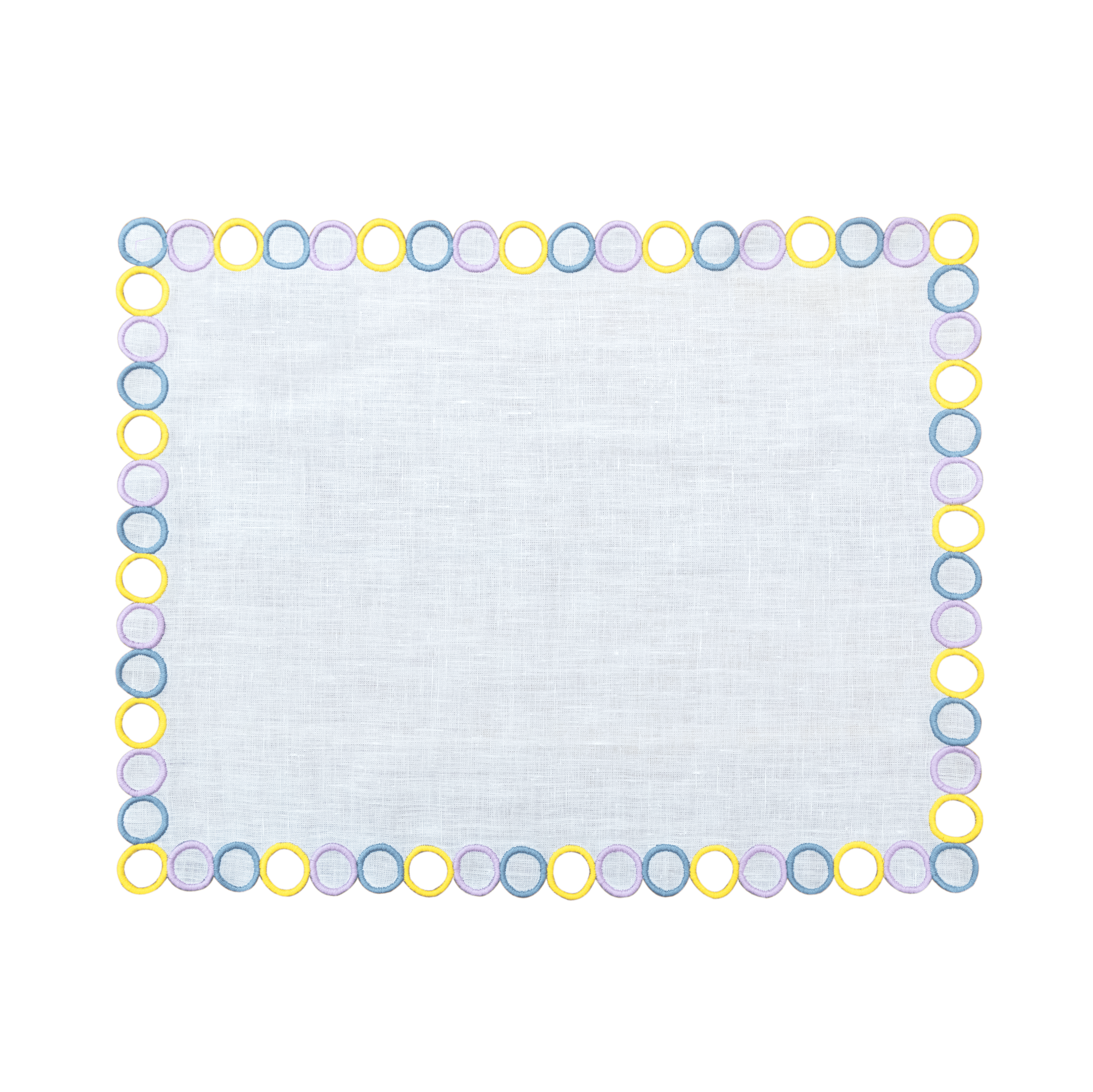 This design showcases embroidered circles around the perimeter, with select circles carefully cut out by hand to add depth and creates a playful optical illusion that is both fun and visually intriguing. This technique produces a subtle movement effect, making the placemat appear lively and contemporary.