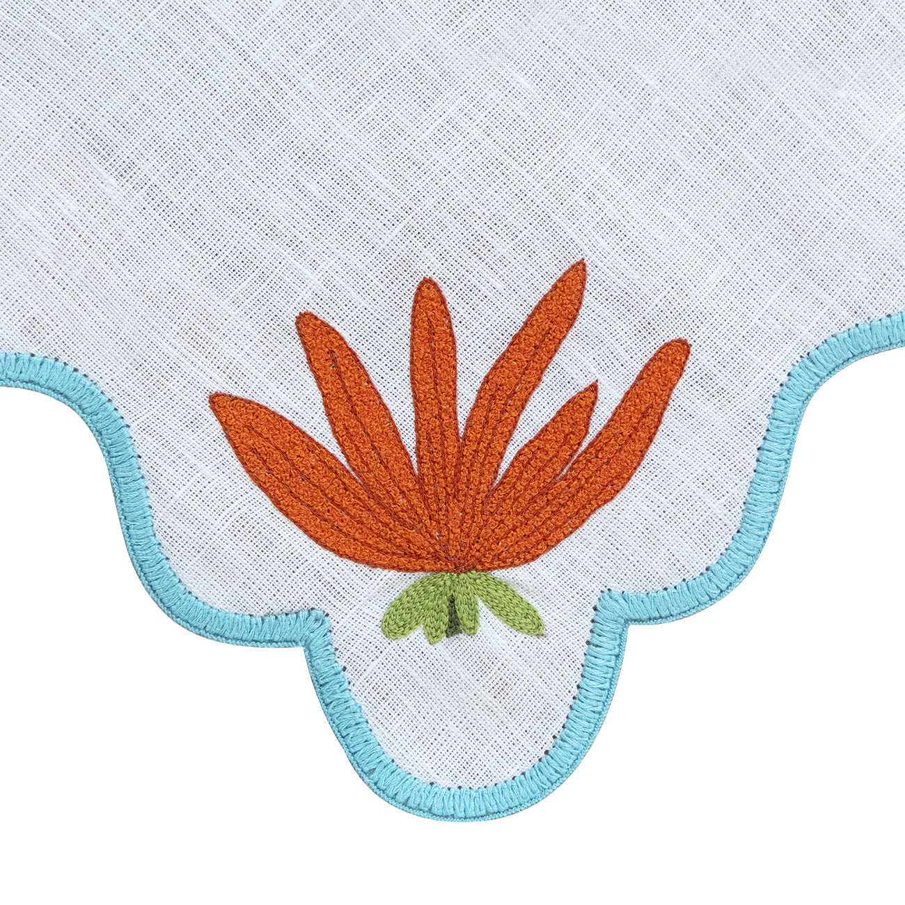 Brighten your table with this stunning hand-embroidered placemat, crafted from 100% premium linen in a vibrant orange hue. Inspired by the bold shapes of contemporary floral design, it features intricate hand embroidery that brings the modar flower motif to life.